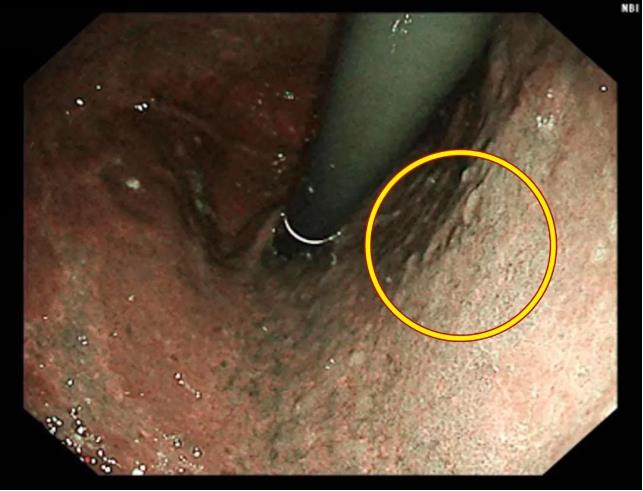 我們檢查的這(zhè)位患者腺體萎縮十分明顯,鏡下可以清楚地觀察到胃黏膜變薄,下層的小血管清晰可見。