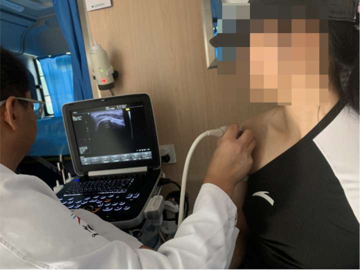 巡診骨科醫生查體發(fā)現,該運動員左肩關節前方輕壓痛,内旋、外旋抗阻試驗陰性,Jobe試驗陰性,熊抱實驗陰性,雙側髌腱周圍壓痛。在移動檢測車上,經(jīng)肌骨超聲檢查進(jìn)一步确認左肩袖損傷(輕微),雙膝髌下脂肪墊炎,但因爲部位較深,需要進(jìn)行核磁檢查。巡診醫生建議該運動員在訓練間隙前往醫院對(duì)左肩關節進(jìn)行核磁共振檢查,觀察肩袖損傷程度。在此之前,暫時外用扶他林藥物對(duì)症治療,運動時可應用肌貼保護。雙膝關節扶他林外用藥物治療,超聲波等理療。